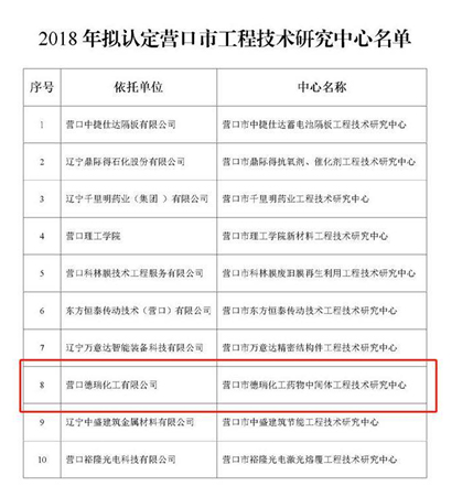 2018年11月9日,營口市科學(xué)技術(shù)局公布了關(guān)于擬認(rèn)定2018年?duì)I口市工程技術(shù)研究中心的公示,依托營口德瑞化工有限公司申報(bào)的“營口市德瑞化工藥物中間體工程技術(shù)研究中心”被列入2018年度市級組建計(jì)劃中。